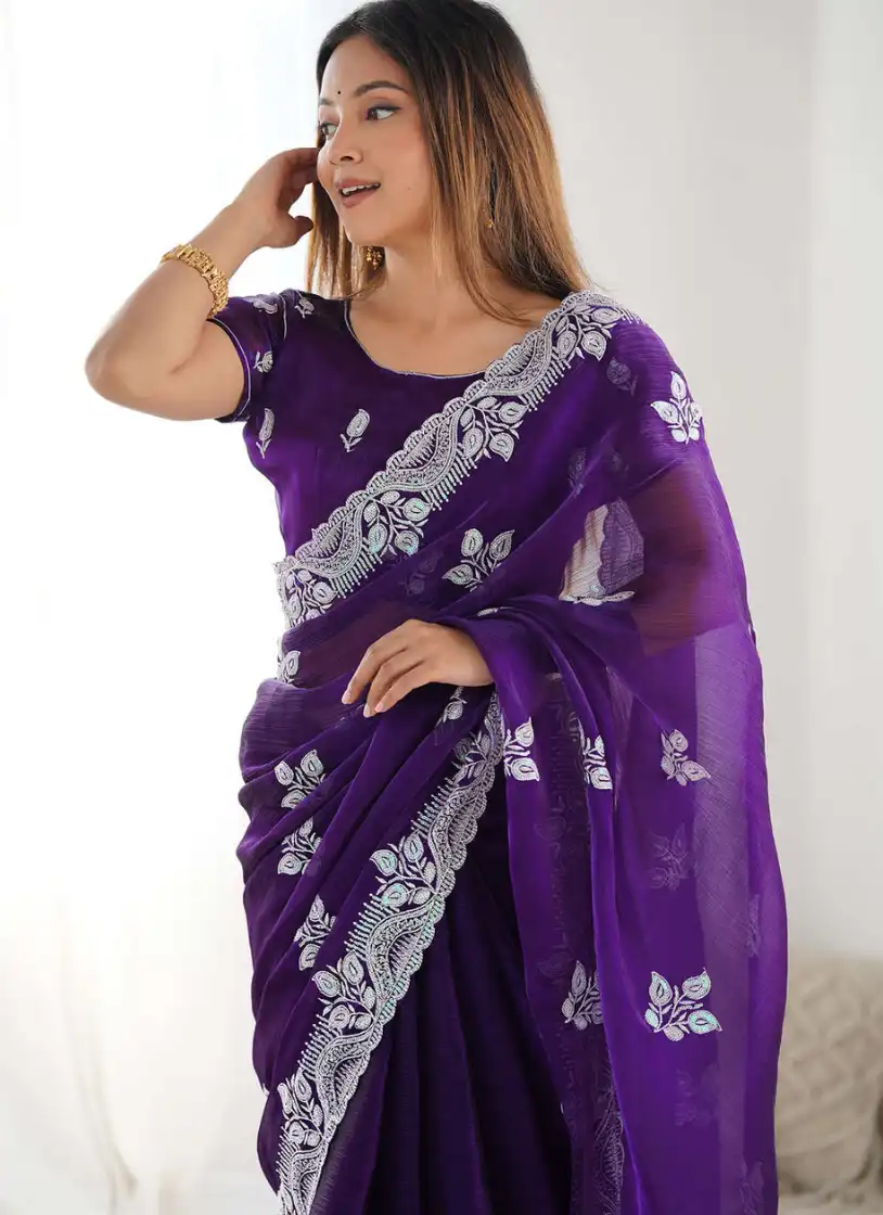 ** অরিজিনাল ইন্ডিয়ান ওয়েটলেস জর্জেট কাপড়ের এমব্রয়ডারি কাজ করা শাড়ি সাথে ব্লাউজ পিস্ থাকছে,
